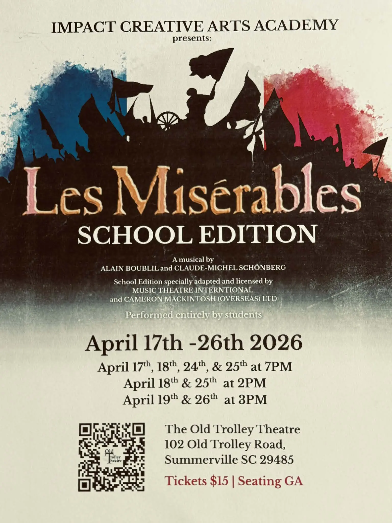 Join us for an unforgettable experience at the Old Trolley Theatre in Summerville! Get ready to be swept away by the iconic musical Les Misérables: School Edition, performed by the incredibly talented advanced students from Impact Creative Arts Academy.