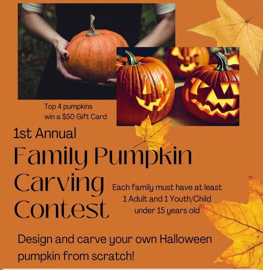 1st Annual Family Pumpkin Carving ContestOctober 26, 20245:00 PM $10 Entry Fee Each family must have atleast 1 Adult and 1 Child under 15. Pumpkin provided along with a Patch…
